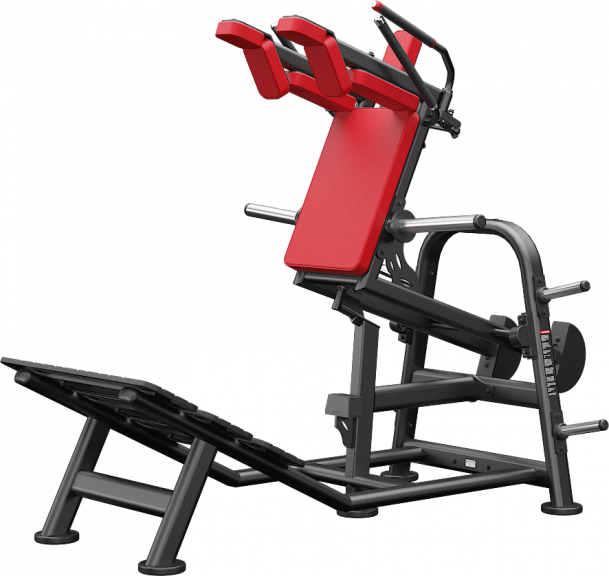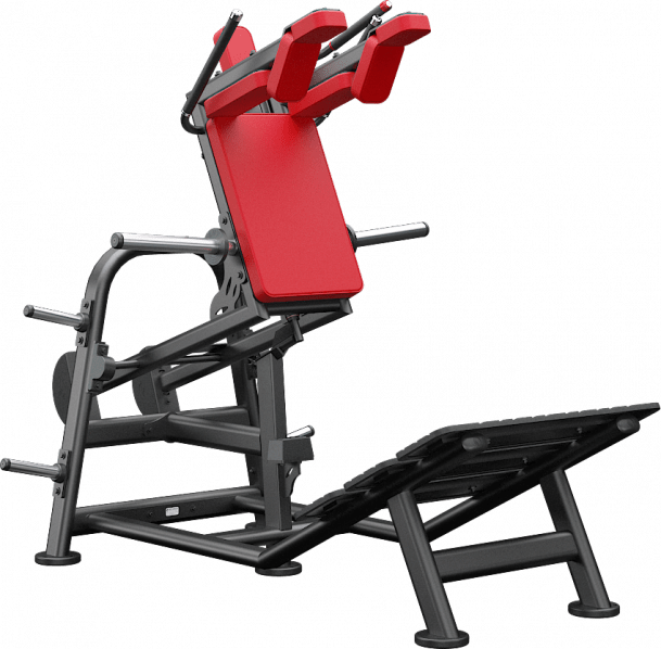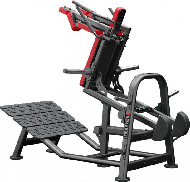 - Adjustable backrest pad allows for alternating between hack squat and leg press positions.