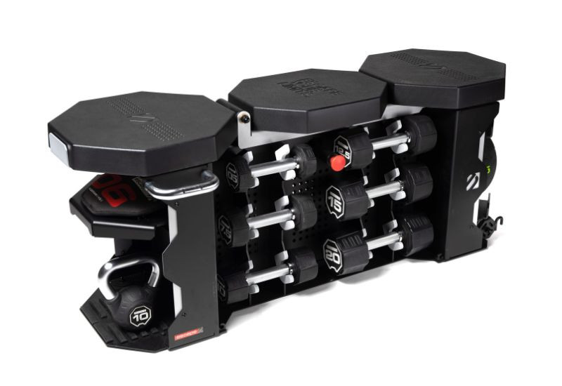 Integrated ABS plastic covers on rack shelving to protect and store up to six pairs of Escape dumbbells.