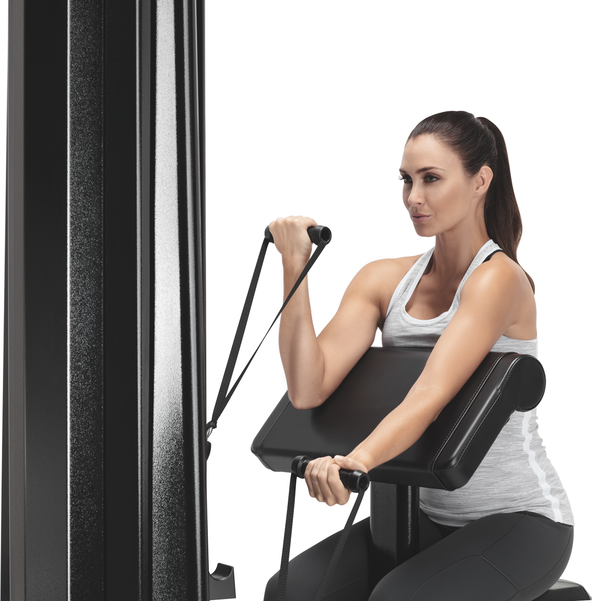 The GENESIS Biceps features the exclusive swivel pulleys and extensive cable travel that can only be found with the GENESIS line. Moving beyond the traditional curl, users can perform compound movements like a single-leg standing biceps curl to overhead press with complete range of motion to add versatility and challenge to a program. Change up the angle of the load and the position of the handles to hit specific area of the biceps and forearms and build grip strength.