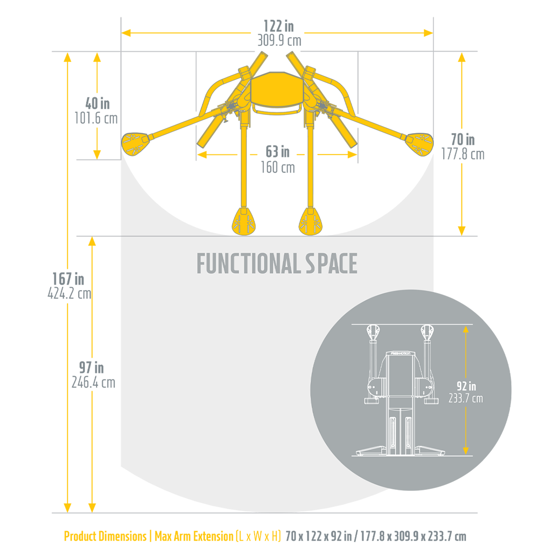 70 x 122 x 92 in / 177.8 x 309.9 x 233.7 cm |