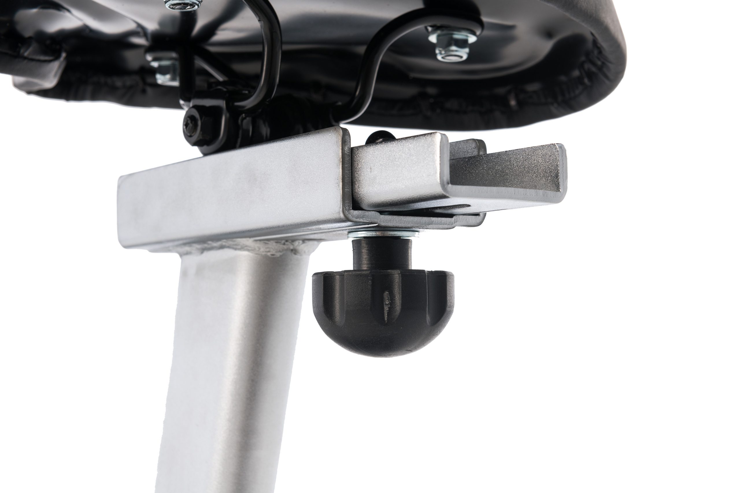 One-hand adjustment enables quick seat positioning, on or off the bike. -